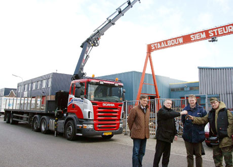 Vorige week werd bij Siem Steur Staalconstructies, gevestigd aan de Parallelweg in Volendam, een nieuwe Scania R 380 vrachtwagen met uitschuifbare trailer afgeleverd.