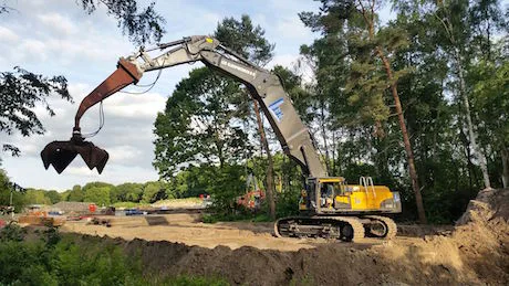 De nieuwe Volvo EC700L van Lek Sloopwerken is dankzij Beco in Vianen een unieke machine. De dikke 100-tonner kan dankzij de aangepaste giek tot 35 meter hoog en tot 13 meter diep slopen. De machtige Zweed is verder voorzien van een lastmomentindicator en een kantelbare cabine.