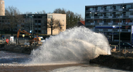 <p><strong>Bij graafwerkzaamheden in Apeldoorn langs de Arnhemseweg is gisterochtend een breuk in de hoofdwaterleiding ontstaan. Het water spoot zo'n acht meter hoog. Ongeveer twee miljoen liter water stroomde in een vers ontgonnen bouwput.</strong></p>
