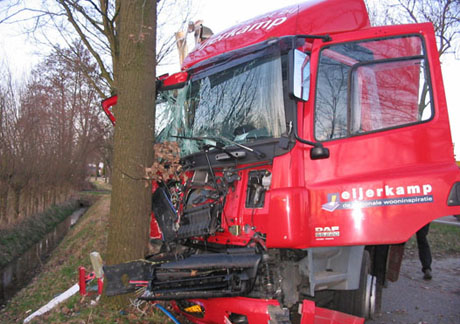 Een vrachtwagen van de firma Eijerkamp uit Zutphen is woensdagmiddag tegen twee bomen aan de Vordenseweg in Hengelo (Gld.) gebotst.
